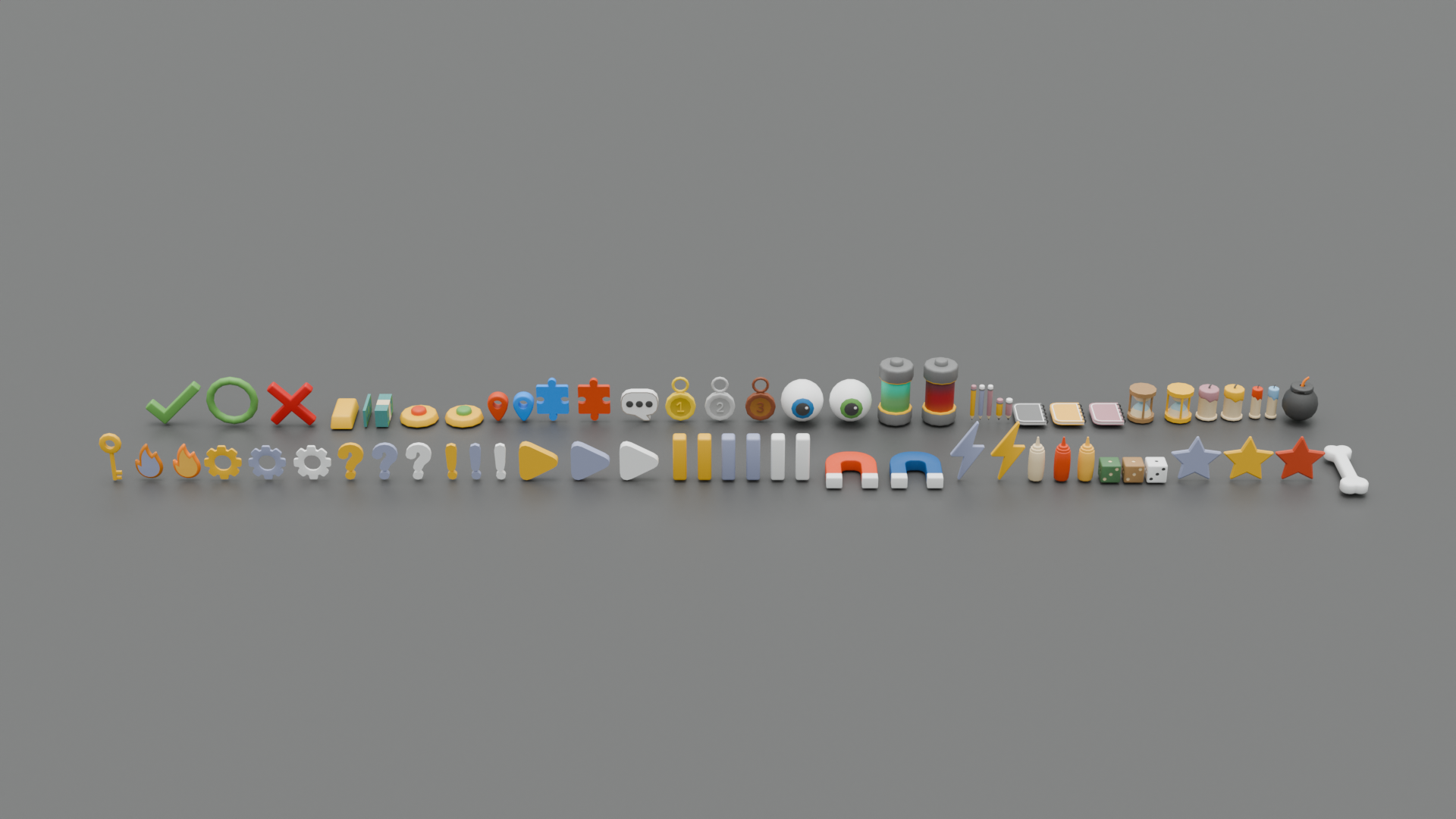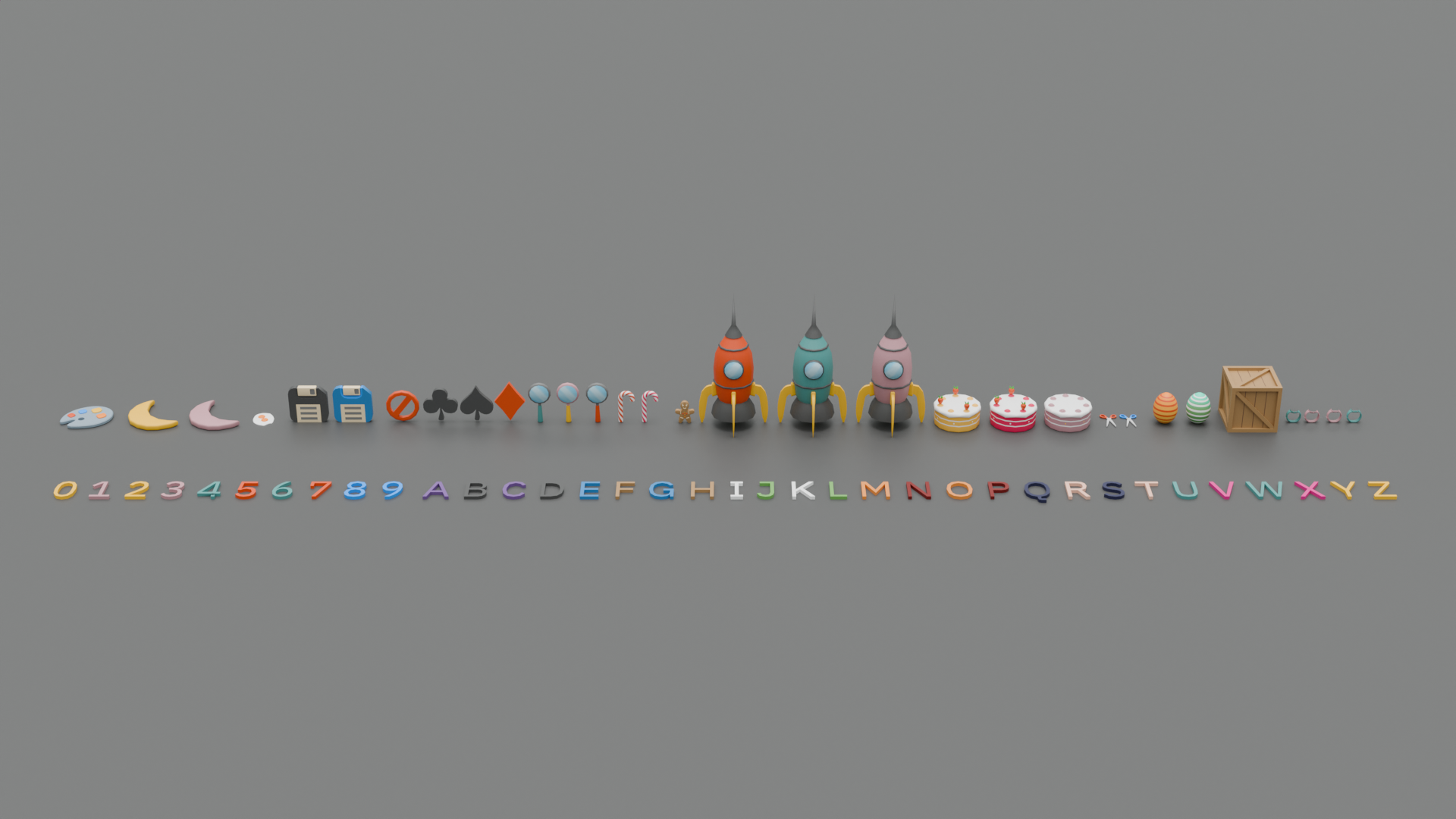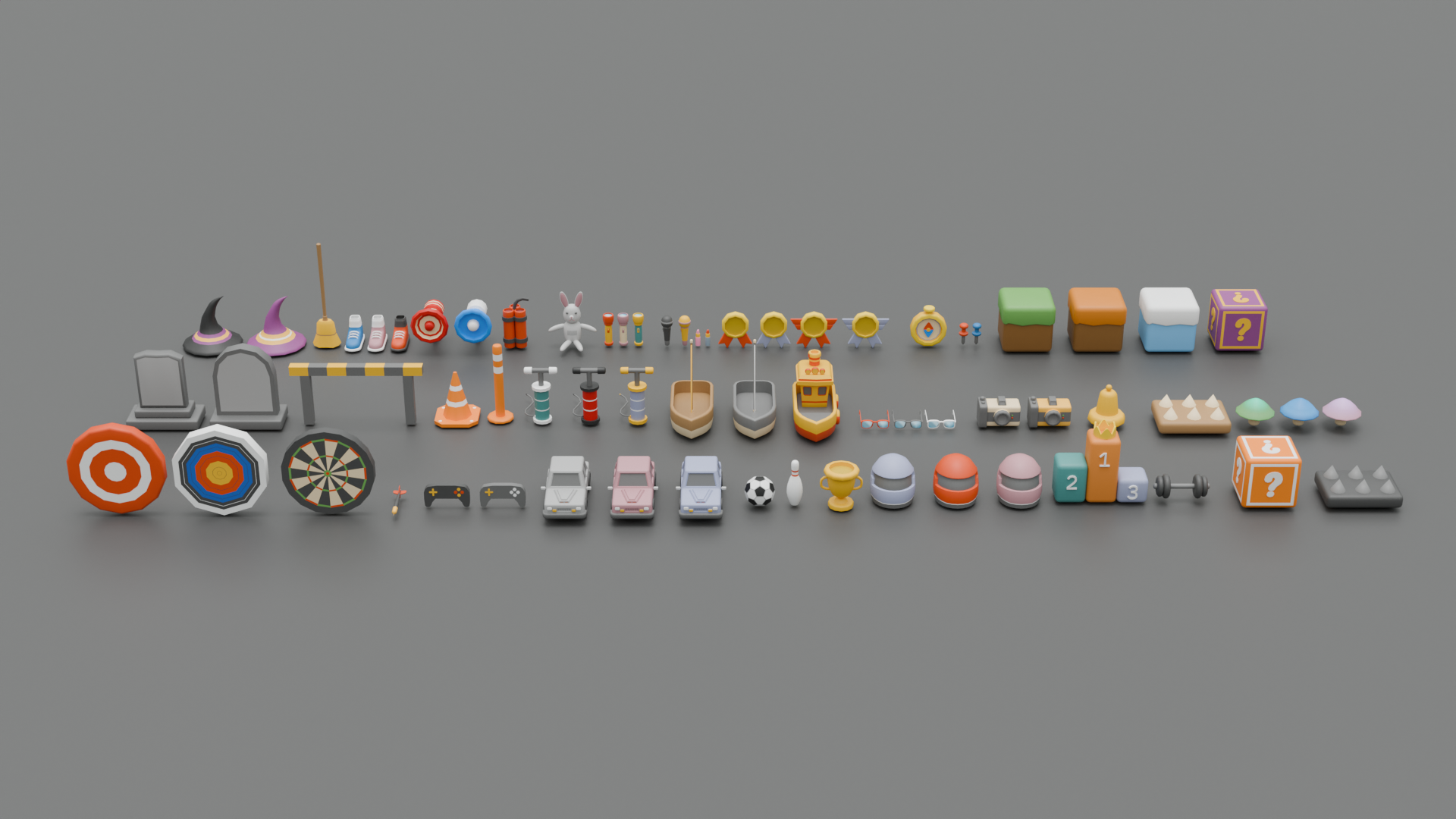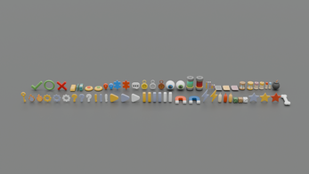 heart,pause,play,blocks,bottles,boat,cars,toys,bomb,bell,book,box,egg,joystick,button,dice,crown,skull,bone,eye,gift,watch,compass and a lot of other models